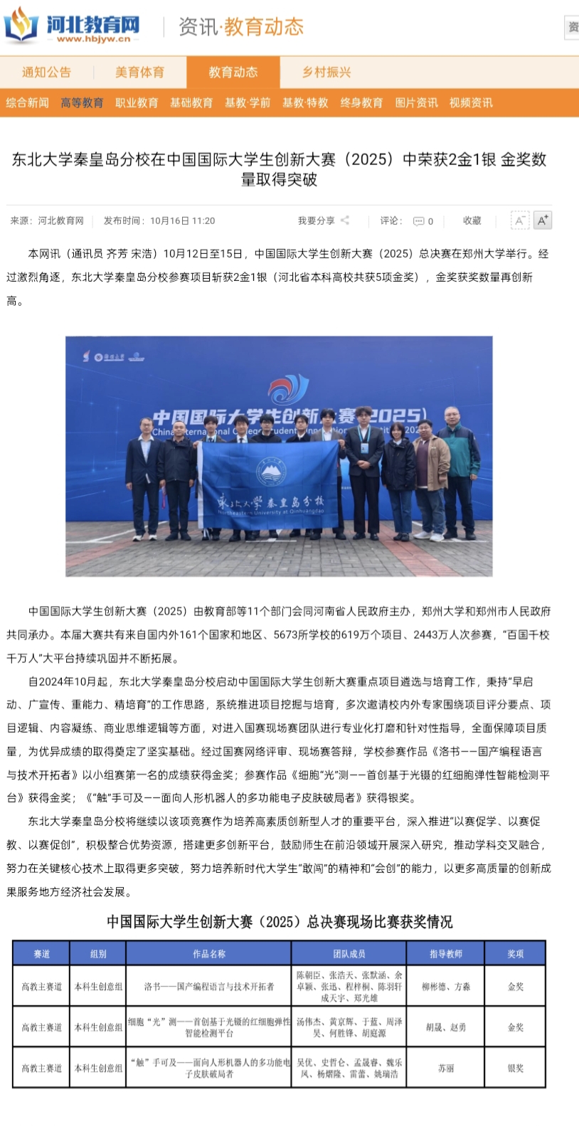 本网讯(通讯员 齐芳 宋浩)10月12日至15日,中国国际大学生创新大赛(2025)总决赛在郑州大学举行。经过激烈角逐,东北大学秦皇岛分校参赛项目斩获2金1银(河北省本科高校共获5项金奖),金奖获奖数量再创新高。