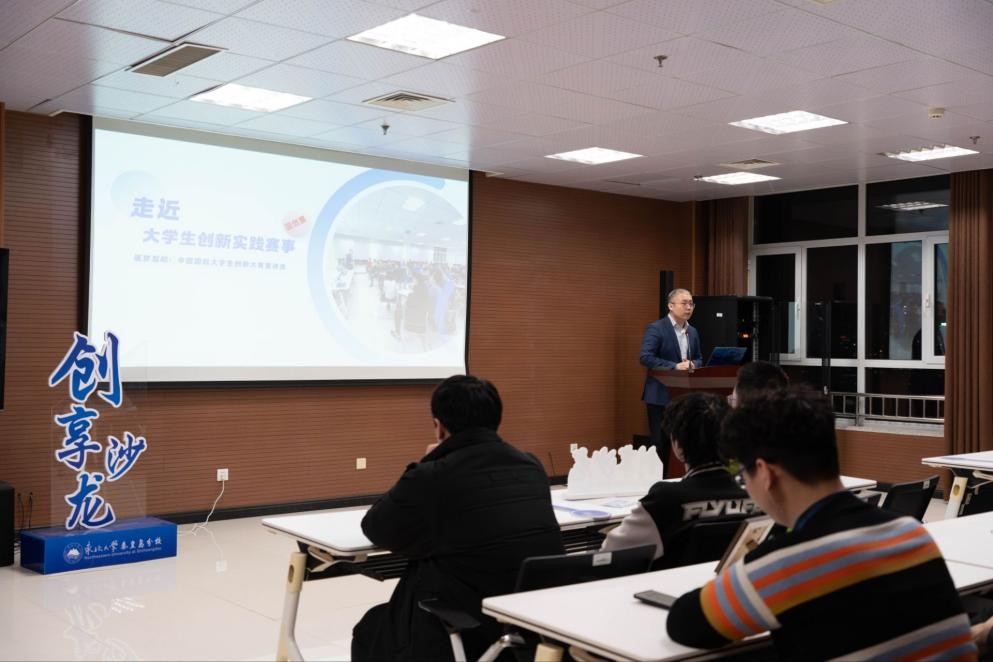 韩鹏结合多年指导全国科创竞赛的经验分享备赛心得,强调科创竞赛的核心是立足创新、贴合实际、落地可行。同时解读大赛参赛要点与注意事项,提醒参赛选手要精准把握赛道差异。此外,韩鹏还从选题、打磨、落地三大环节,给出打造优秀项目、高质量备赛的具体途径,以往届优秀作品为例解析备赛中的常见难点与疑问,为我校学子备战2026年中国国际大学生创新大赛明晰了思路、提供了方法。