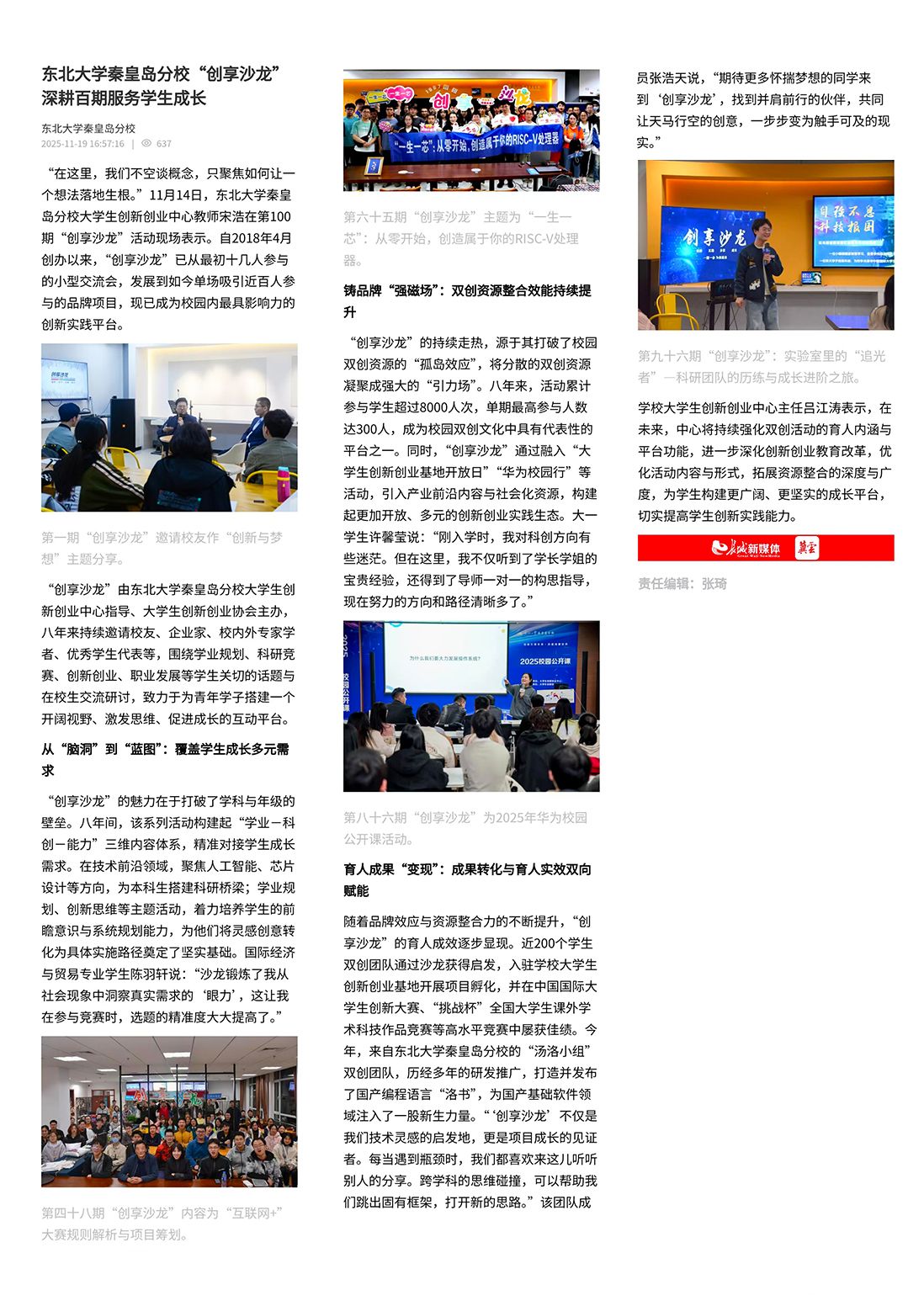 “在这里,我们不空谈概念,只聚焦如何让一个想法落地生根。”11月14日,东北大学秦皇岛分校大学生创新创业中心教师宋浩在第100期“创享沙龙”活动现场表示。自2018年4月创办以来,“创享沙龙”已从最初十几人参与的小型交流会,发展到如今单场吸引近百人参与的品牌项目,现已成为校园内最具影响力的创新实践平台。