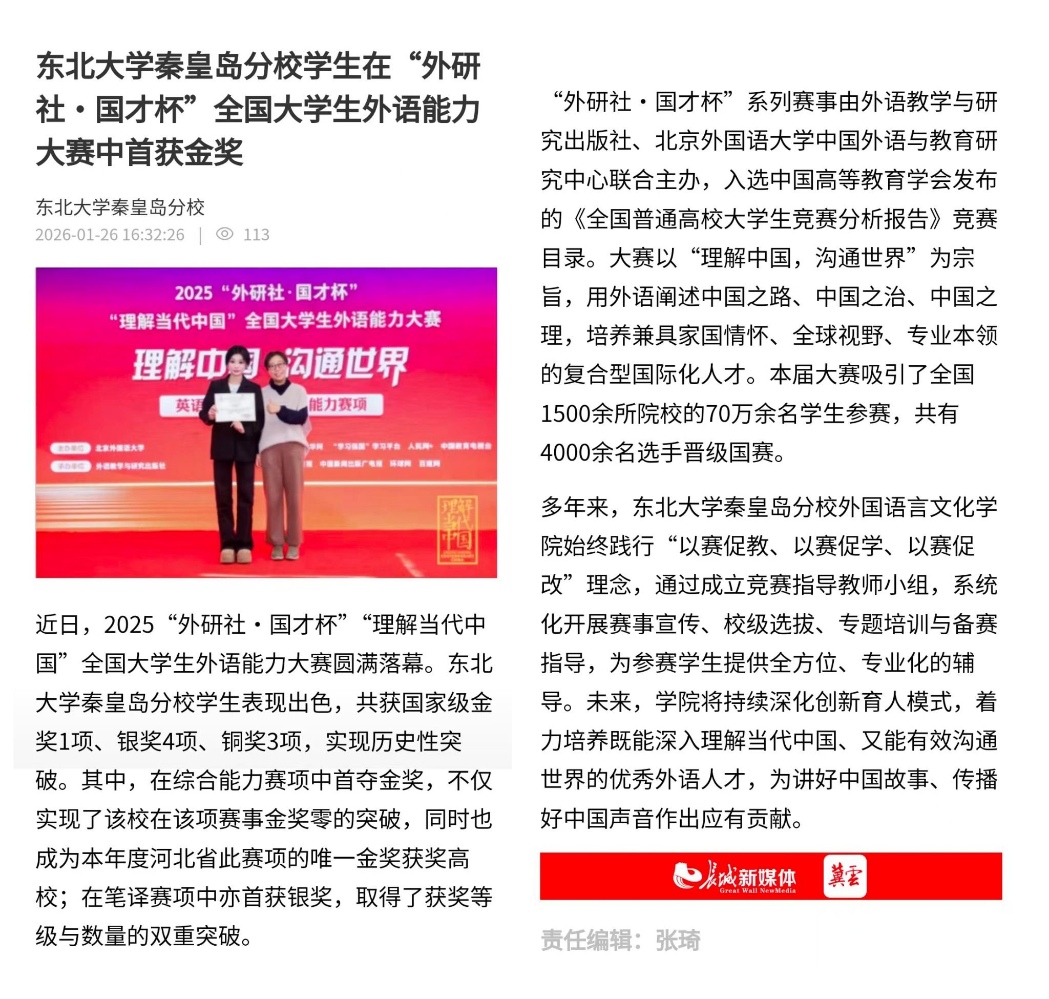 多年来,东北大学秦皇岛分校外国语言文化学院始终践行“以赛促教、以赛促学、以赛促改”理念,通过成立竞赛指导教师小组,系统化开展赛事宣传、校级选拔、专题培训与备赛指导,为参赛学生提供全方位、专业化的辅导。未来,学院将持续深化创新育人模式,着力培养既能深入理解当代中国、又能有效沟通世界的优秀外语人才,为讲好中国故事、传播好中国声音作出应有贡献。